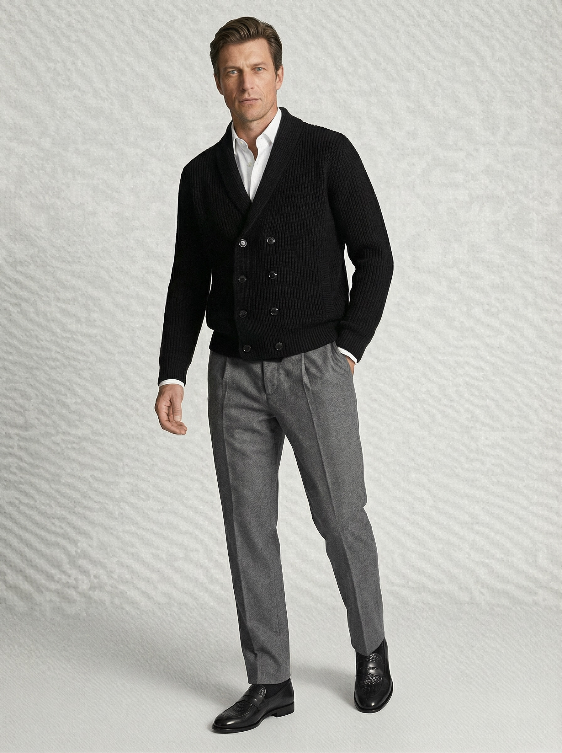 Для поціновувачів невимушеної естетики: м’який кардиган додає затишку, а сорочка й лофери задають точний святковий настрій.