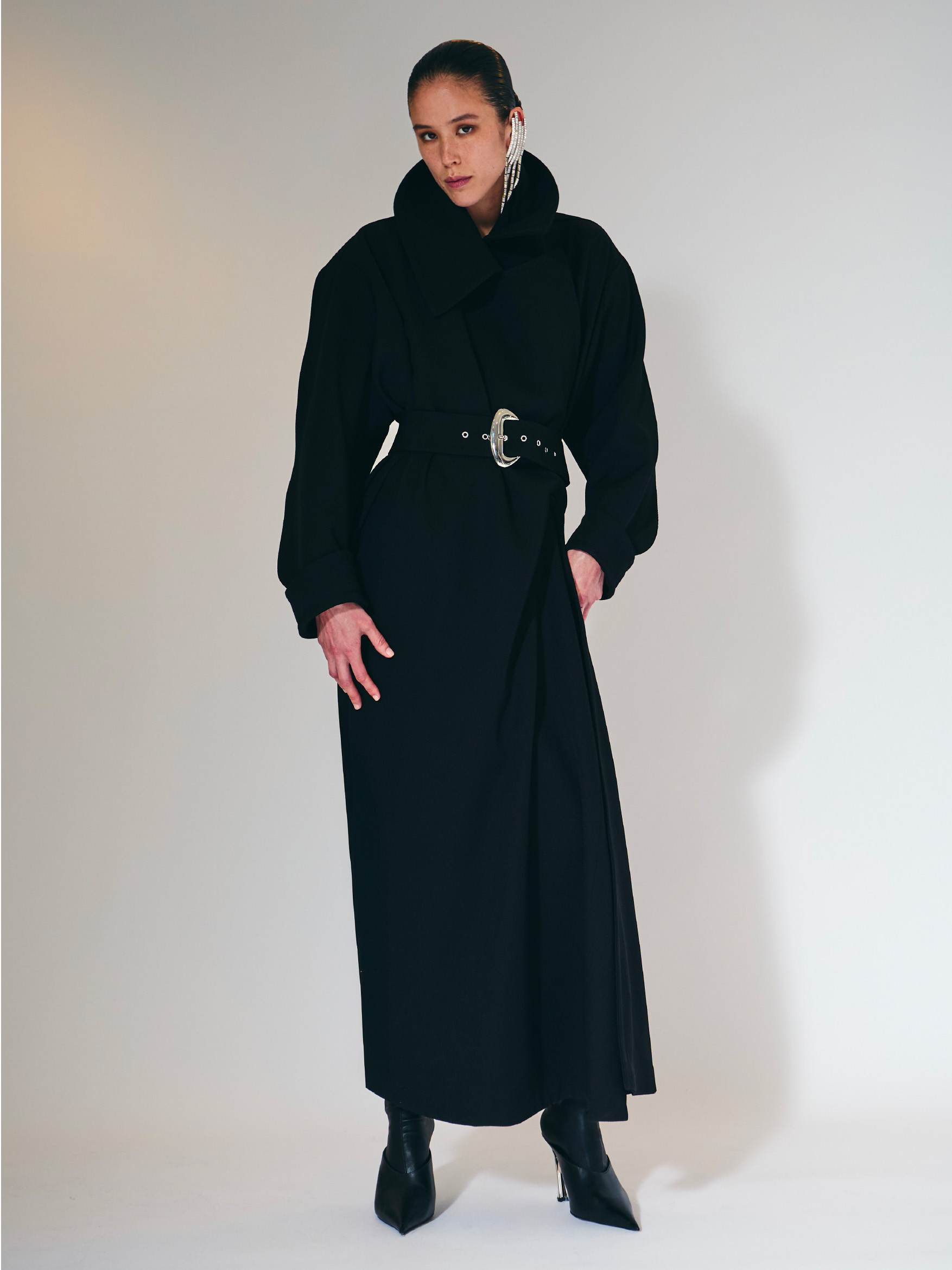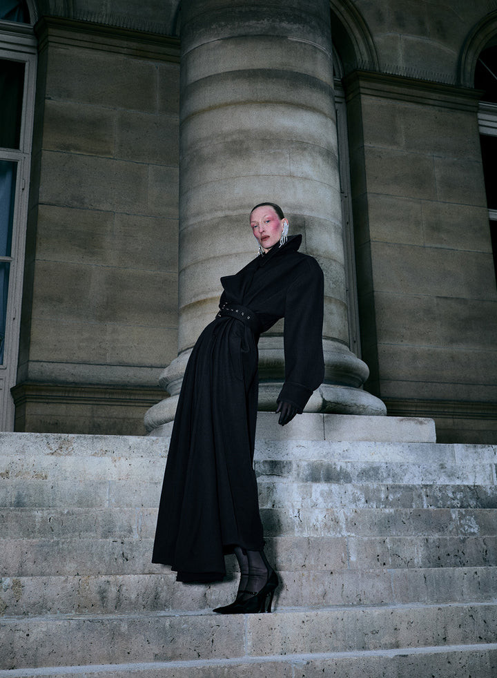 Чорний вовняний тренч у мілітарі стилі з колекції Hiver Russe prêt-à-porter осінь/зима 1986–1987.