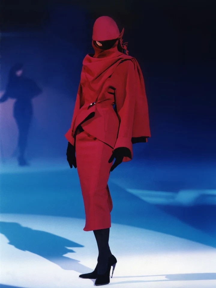 Червоний жакет-шарф і спідниця зі щільної вовни з колекції Les Chimères haute couture осінь/зима 1997–1998.
