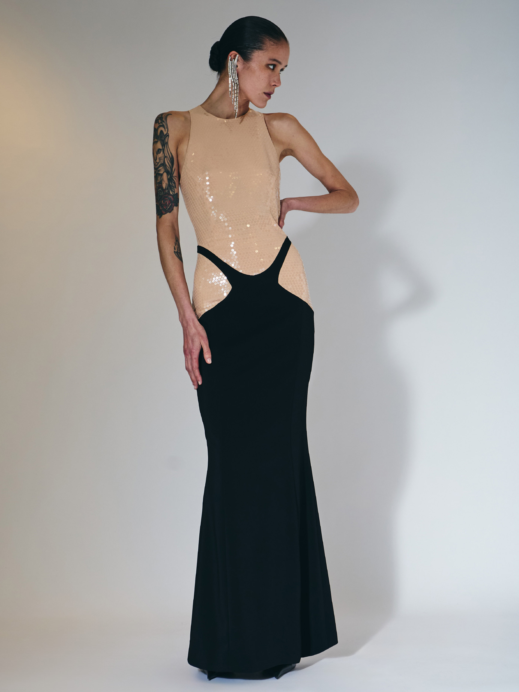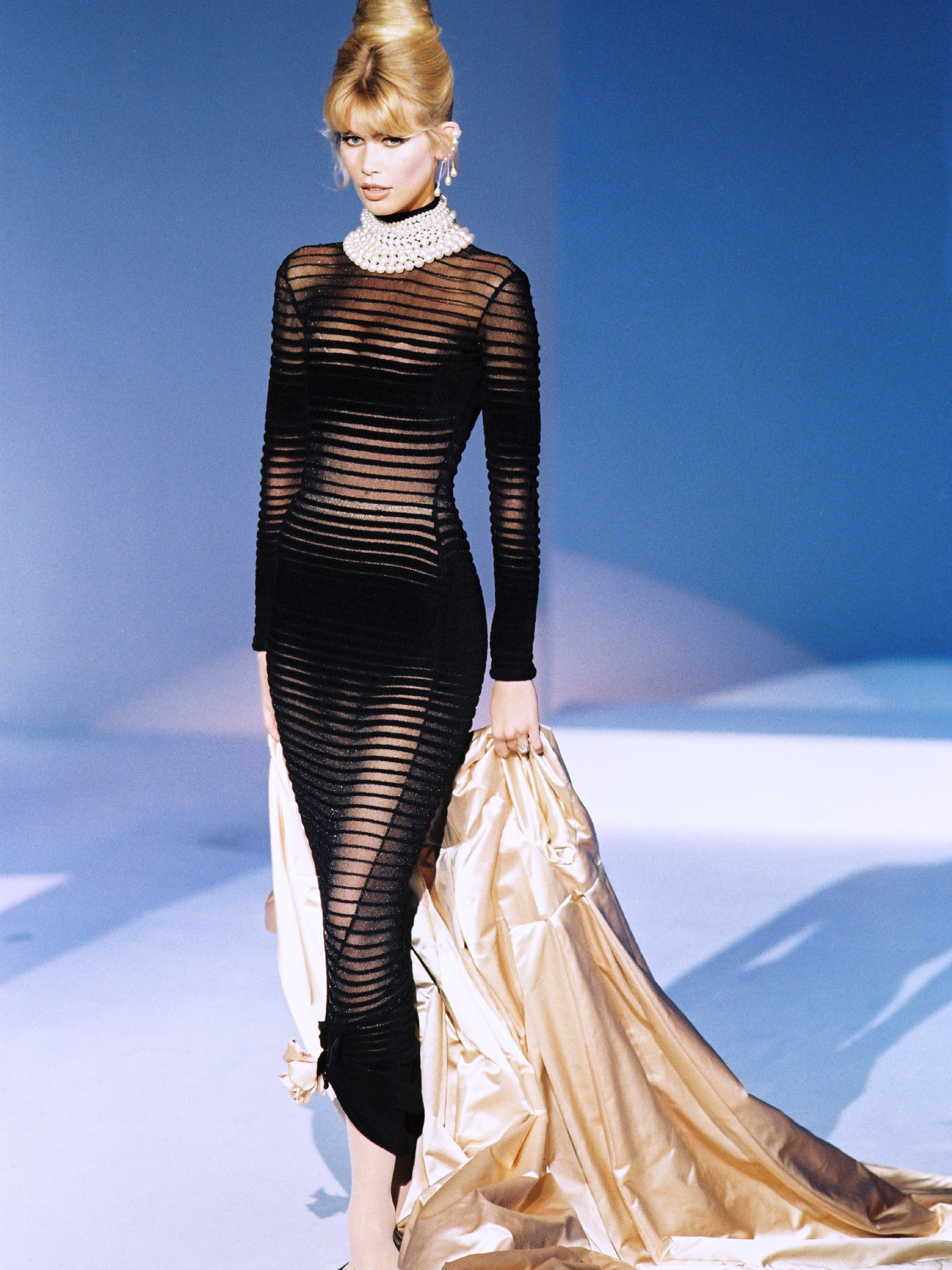 Сукня з ефектом trompe-l’œil — витонченою ілюзією, де нюдовий корсаж із сітки, розшитий паєтками, переходить у довгу чорну спідницю з крепу з колекції Jeu de Paume couture весна/літо 1998.